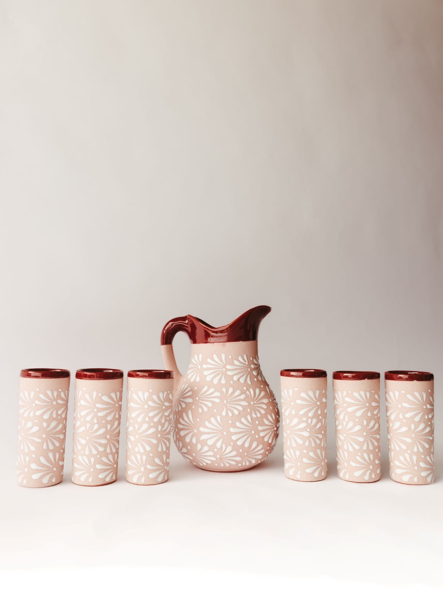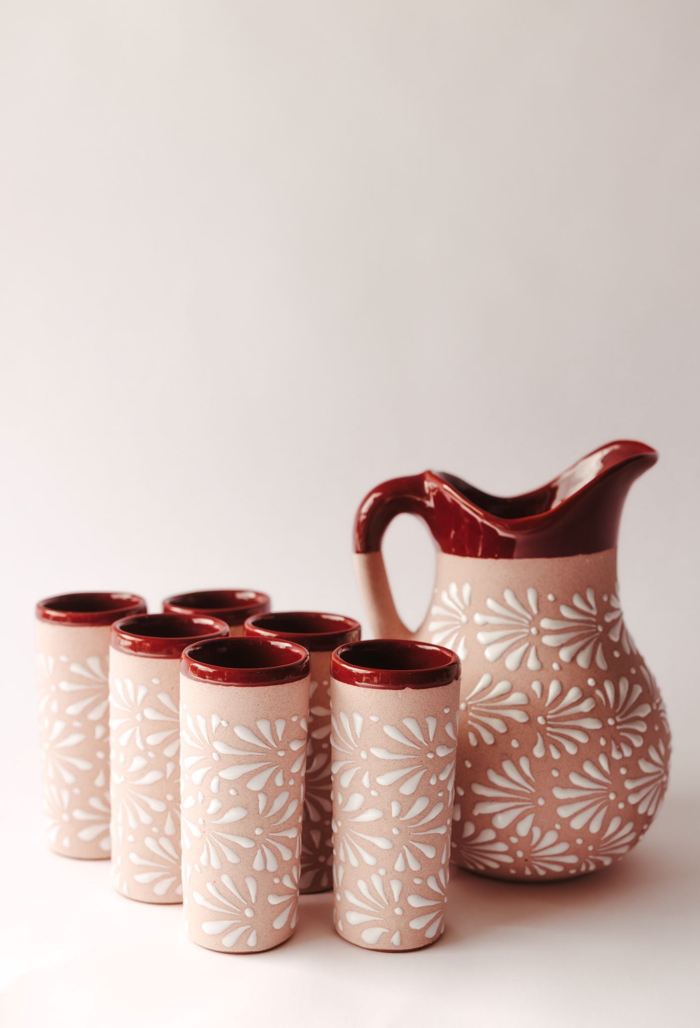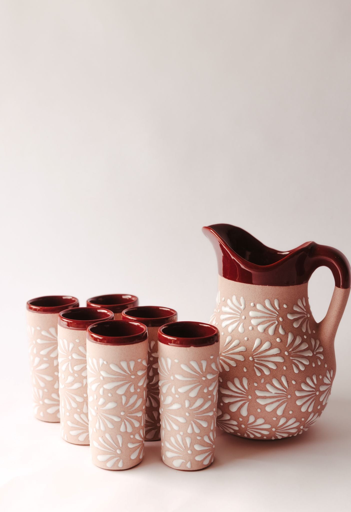 The Jarra Gianna is a classic pitcher with elegant curves, paired with coordinating cups designed for sharing. Featuring hand-etched floral motifs and warm terracotta accents, this set blends tradition with modern refinement.