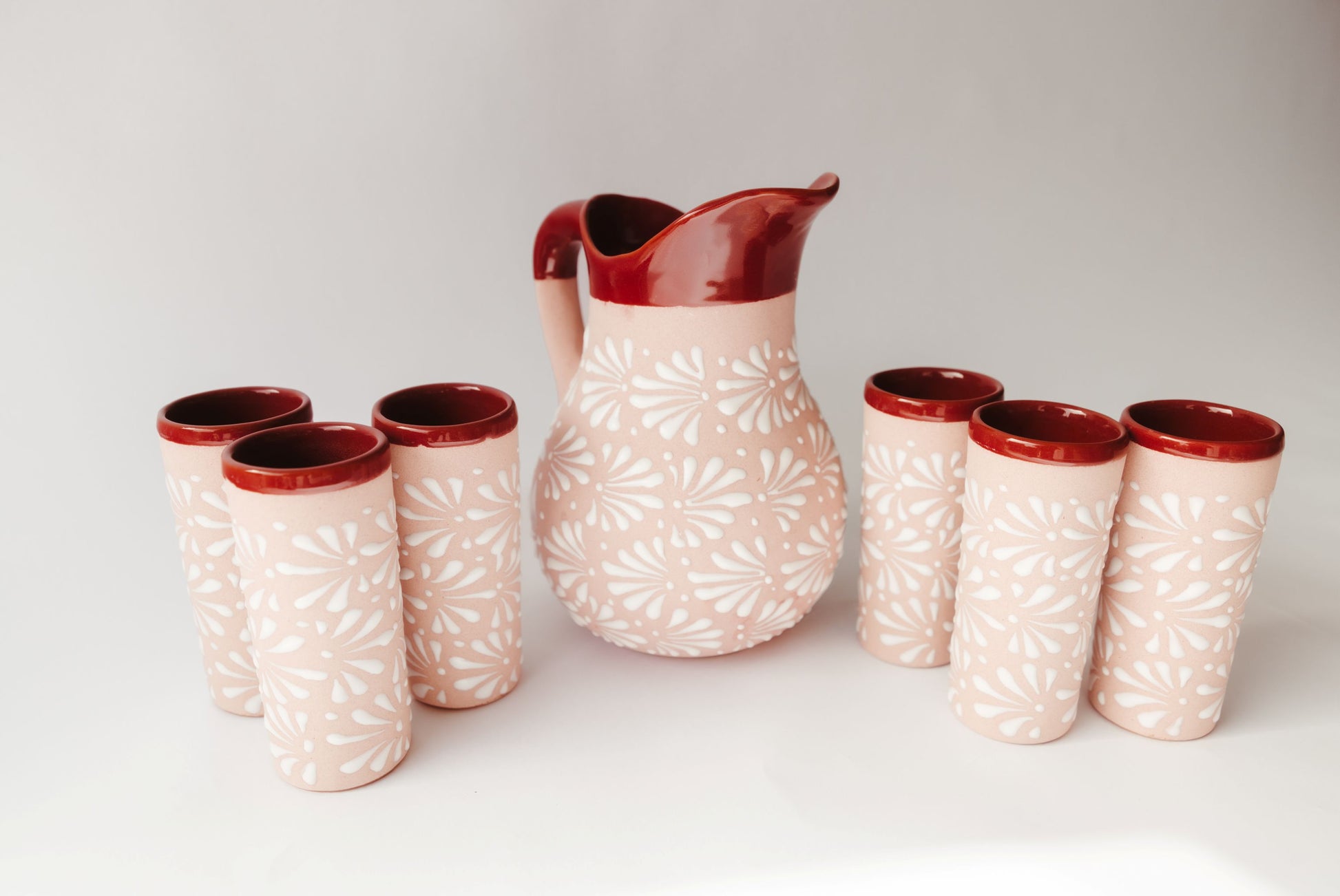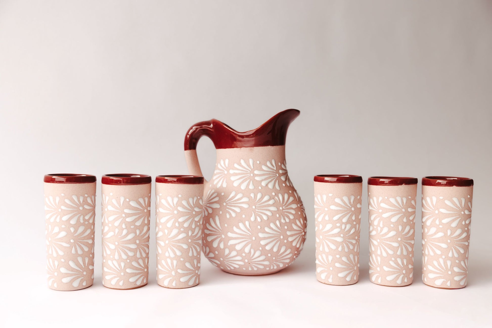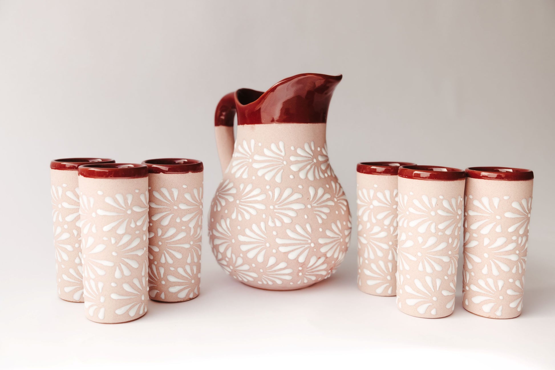 The Jarra Gianna is a classic pitcher with elegant curves, paired with coordinating cups designed for sharing. Featuring hand-etched floral motifs and warm terracotta accents, this set blends tradition with modern refinement.