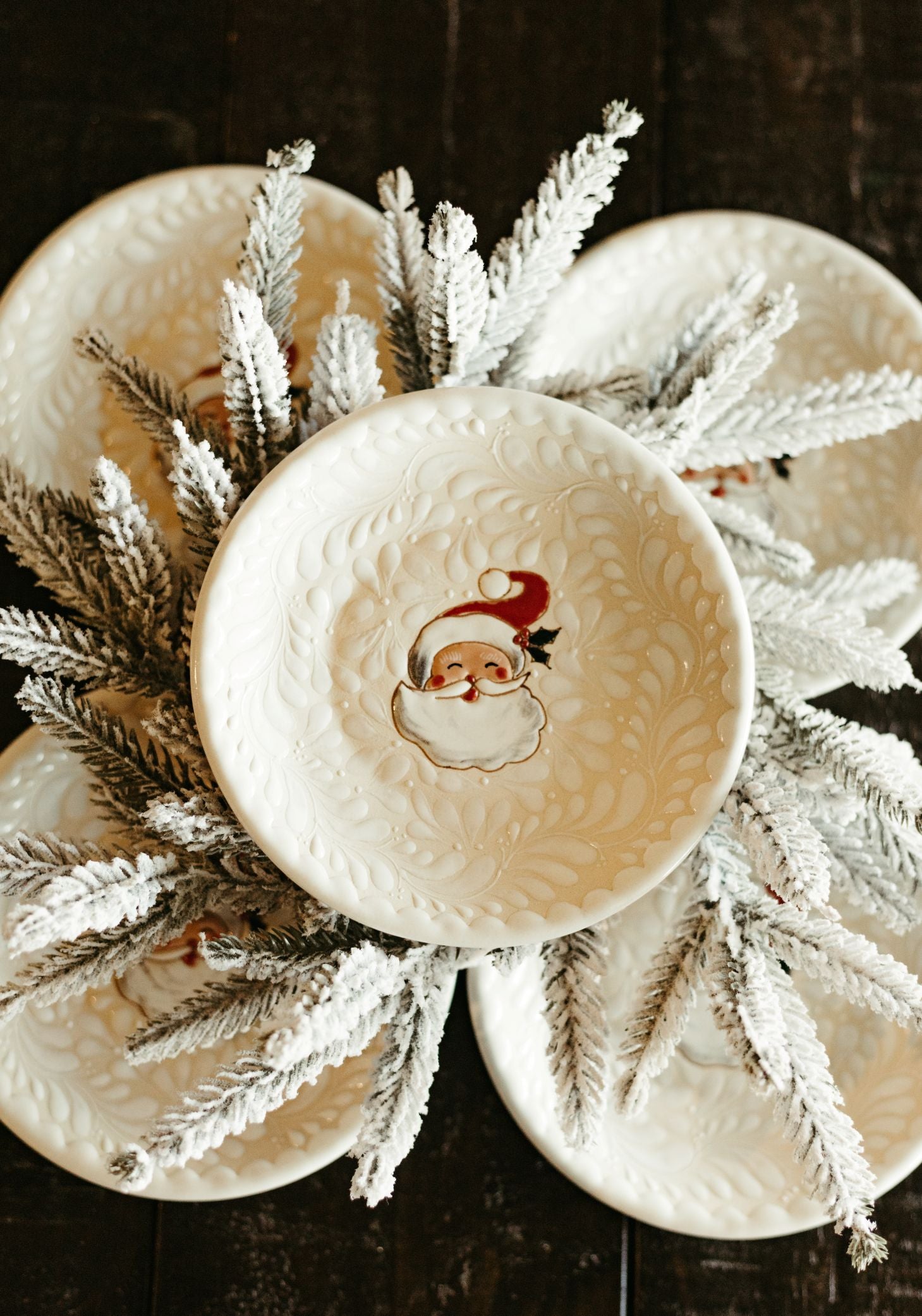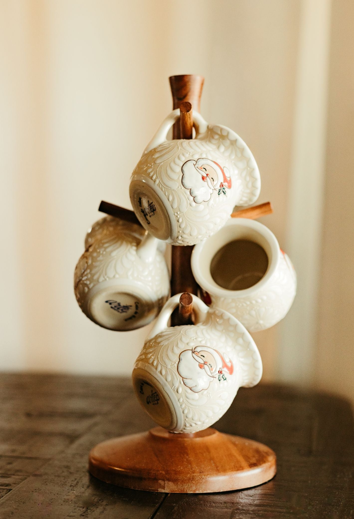 Each piece features a soft cream-toned glaze, delicate raised detailing, and an adorable Santa motif that makes every cup feel like a holiday moment.
